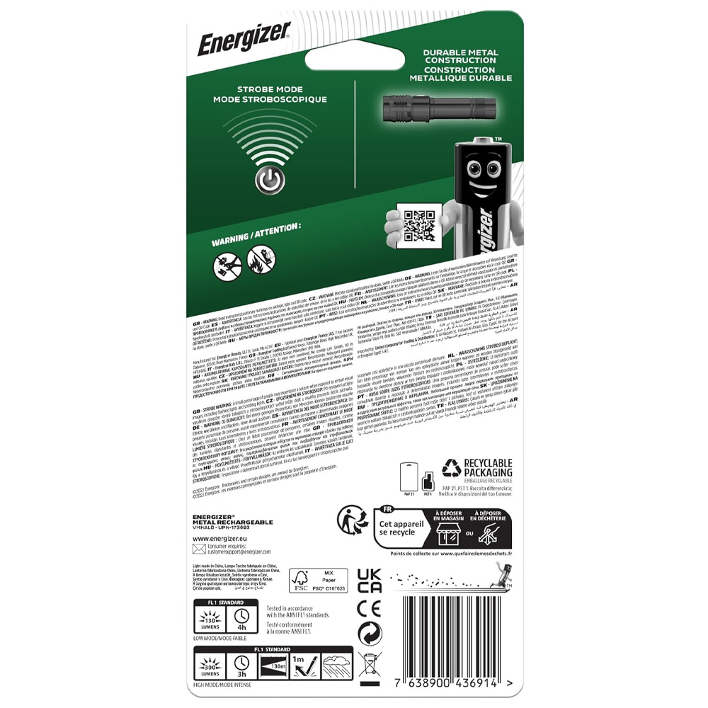 Energizer Metal Recharge Flashlight 300 Lumens