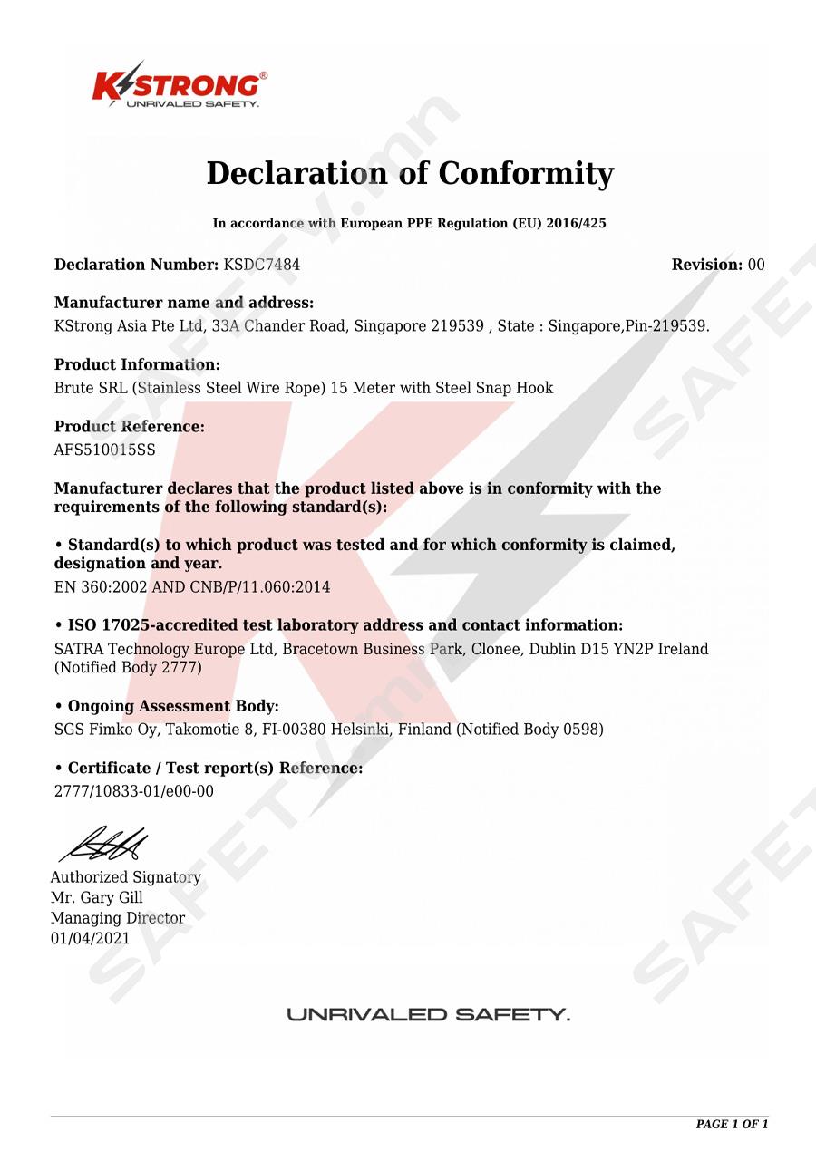 KStrong Brute SRL Block (Wire Rope) 15 Meter with Steel Snap Hook