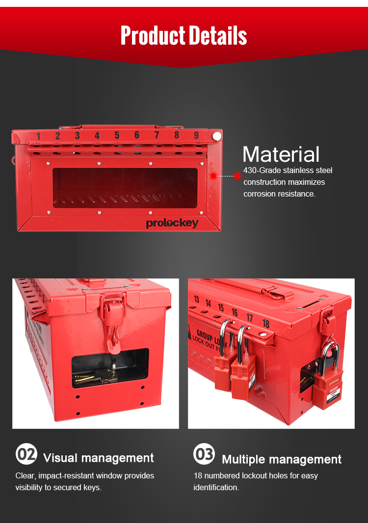 d) 18 numbered lockout holes for easy identification.